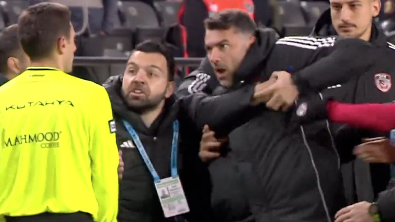 Gaziantep FK Teknik Direktörü Burak Yılmaz, Tayyip Talha Sanuç'un kırmızı kart görmesinin ardından sinirlerine hakim olamayarak karşılaşmanın hakemlerinin üzerine yürüdü.