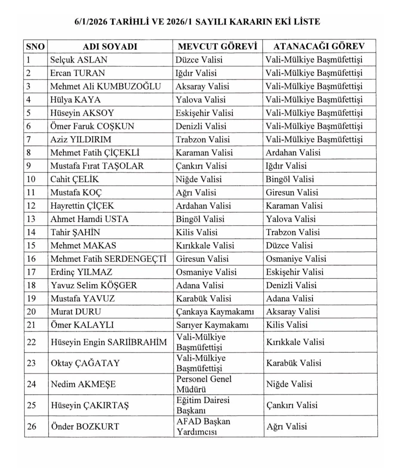 Cumhurbaşkanlığı kararnamesiyle yayımlanan ek listede, çok sayıda valinin merkeze alındığı ve bazı iller arasında karşılıklı görev değişikliklerinin yapıldığı görüldü. Buna göre Düzce, Iğdır, Aksaray, Yalova, Eskişehir, Denizli ve Trabzon valileri Vali–Mülkiye Başmüfettişliği görevine atanırken, farklı illerde yeni vali atamaları gerçekleştirildi.