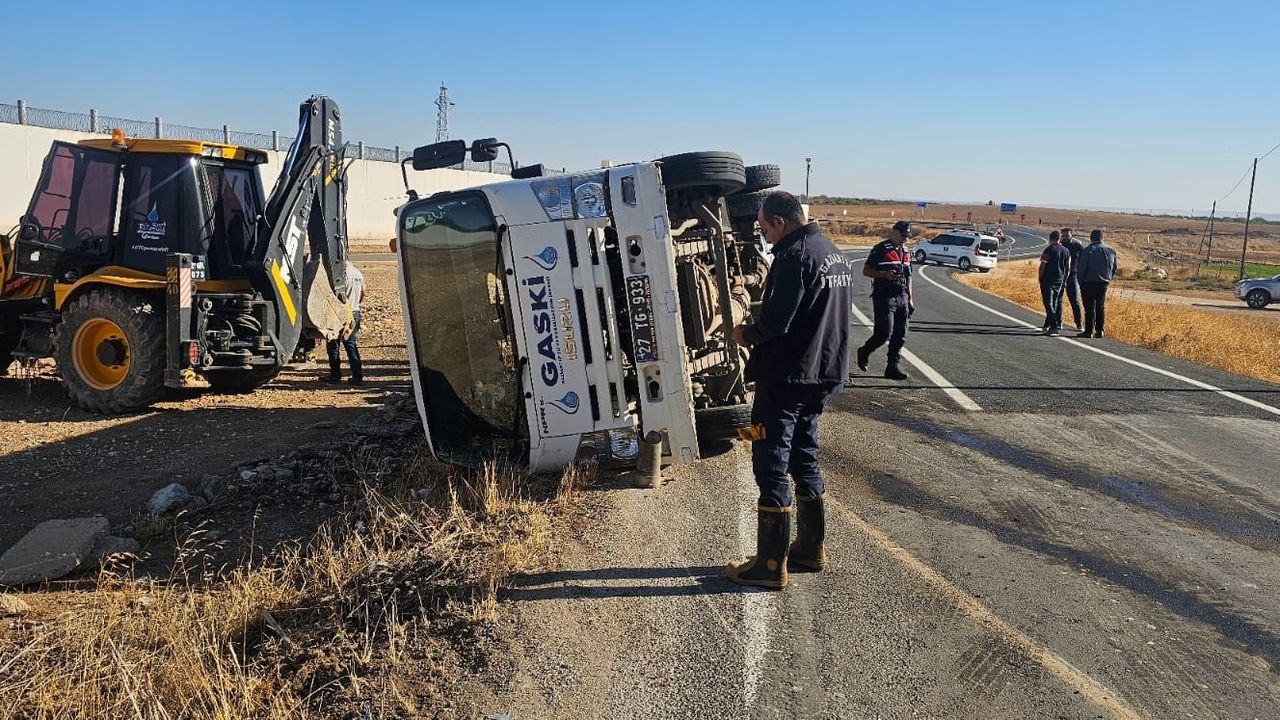 Karkamış ilçesinde devrilerek yan yatan yakıt tankerinin sürücüsü hafif yaralandı.
