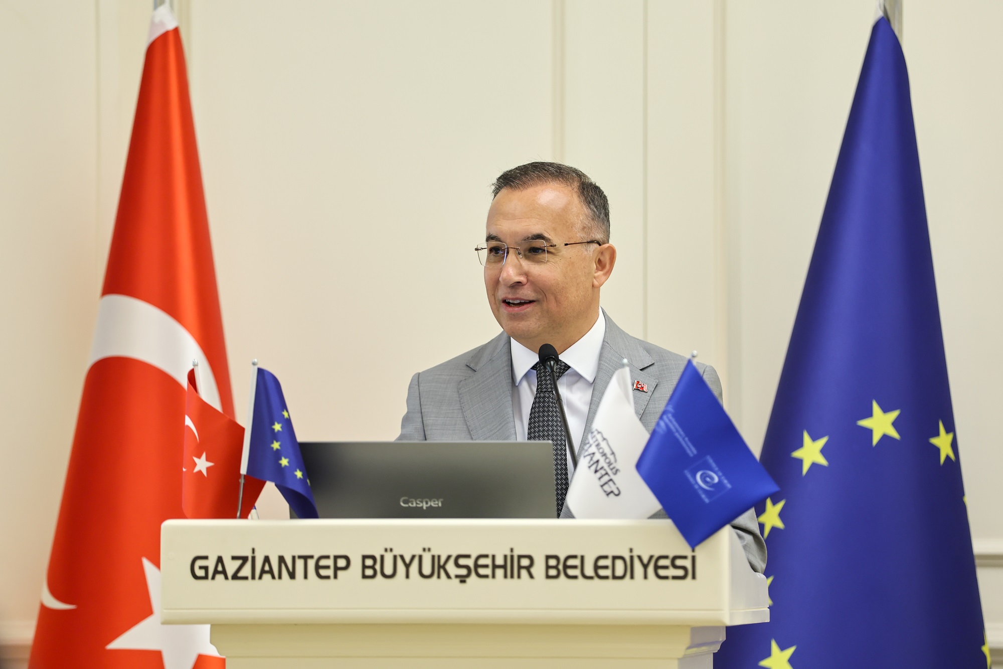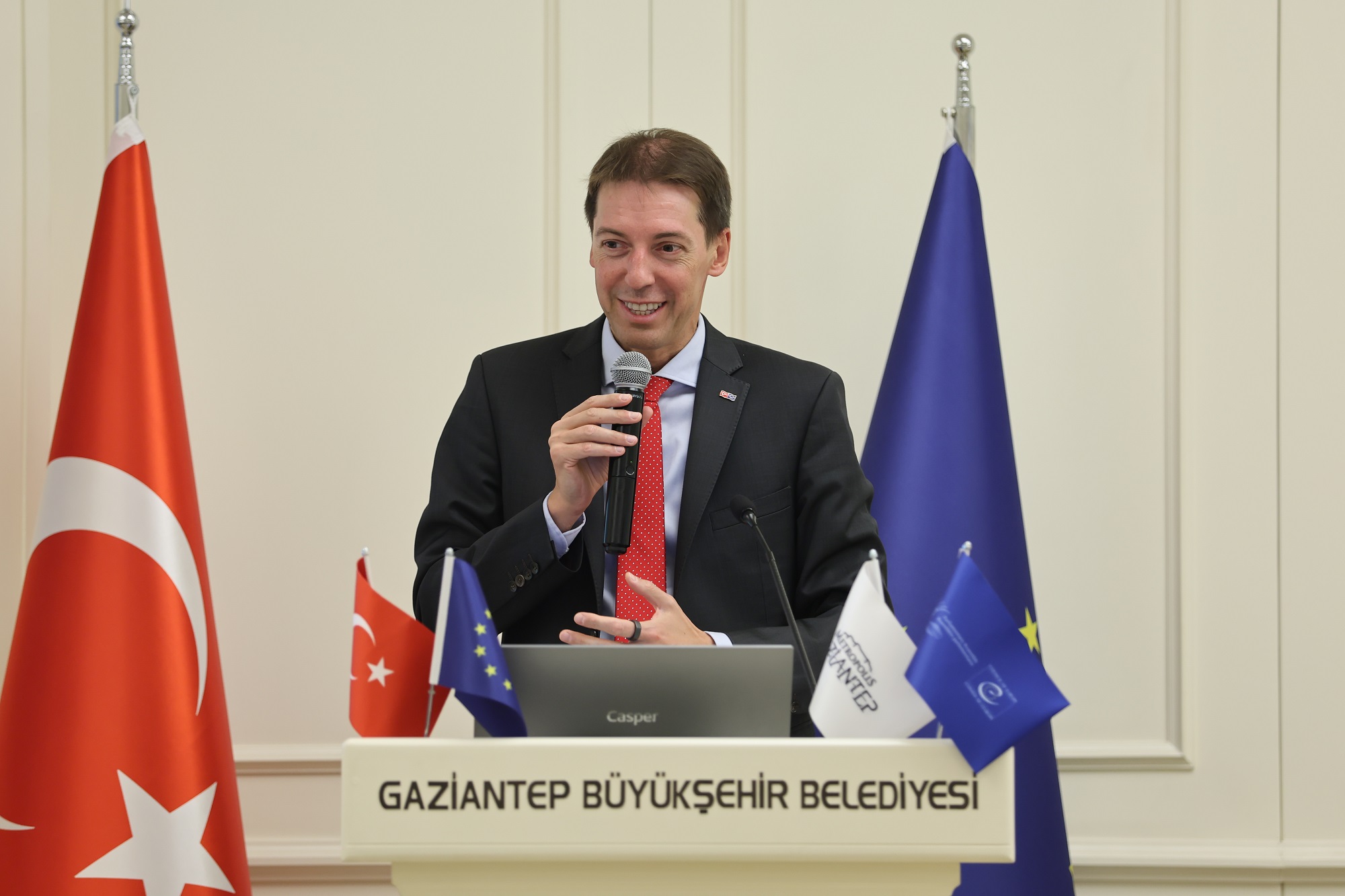 Avrupa Birliği Türkiye Delegasyonu Başkan Yardımcısı ve Maslahatgüzar Jurgis Vilcinskas, Yerel yönetimlerin kalkınmadaki rolünü vurgulayarak, “Gaziantep örneği bize yerel liderliğin ne kadar belirleyici olduğunu gösteriyor. Avrupa Birliği üyesi ülkeler olarak bir amaç uğruna birleştiğimizde, sadece sağlık, eğitim ya da çevre değil, her alanda sürdürülebilir ve nitelikli bir kalkınma ortamı yaratabiliyoruz” diye konuştu. Gaziantep’in uluslararası düzeyde güçlü bir başarı hikayesine sahip olduğunu ifade eden Vilcinskas, “Bu şehir sadece Türkiye’de değil, Avrupa Birliği ve dünya çapında da örnek bir model haline geldi. Önümüzdeki günlerde iş birliği alanlarını genişletmek, yeni ortak projeler geliştirmek için verimli görüşmeler gerçekleştireceğiz. Belediye Başkanı Sayın Fatma Şahin’e misafirperverliği ve liderliği için teşekkür ediyorum” ifadelerini kullandı.