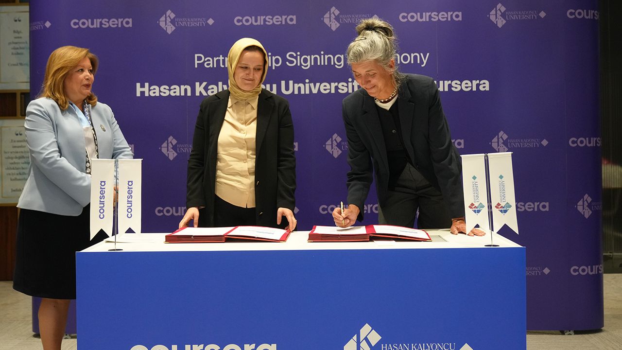HKÜ’nün küresel eğitim vizyonunu güçlendiren ve öğrencilerine uluslararası düzeyde geçerli mesleki becerileri kazandırmayı hedefleyen iş birliği protokolünün imza törenine, HKÜ Rektör Vekili Prof. Dr. Gül Rengin Küçükerdoğan, HKÜ Sürekli Eğitim Merkezi Koordinatörü Esra Değerli ve Coursera İçerik Direktörü Marni Baker Stein ve ekibi katıldı. Coursera ile yapılan iş birliğinin üniversitenin uluslararası eğitimdeki konumunu daha da güçlendireceğini vurgulayan HKÜ Rektör Vekili Prof. Dr. Gül Rengin Küçükerdoğan, "Hasan Kalyoncu Üniversitesi olarak çağın gerekliliklerine uygun, yenilikçi ve dijital öğrenme odaklı bir vizyonla ilerliyoruz. Coursera ile yaptığımız bu iş birliği, öğrencilerimizin küresel ölçekte rekabet etmelerine ve mikro yeterlilikler aracılığıyla mesleki beceriler kazanmalarını sağlayacaktır. HKÜ, mezunlarının istihdam edilebilirliğini artırmayı, yaşam boyu öğrenmeyi teşvik etmeyi ve uluslararası eğitimde etkin bir aktör olmayı hedeflemiş bir üniversitedir. Coursera ile yapılan bu iş birliği, bu vizyonun somut bir göstergesidir" dedi.