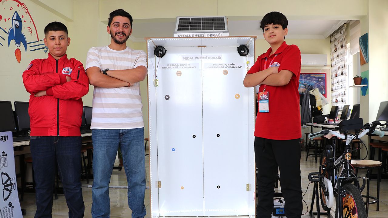 Şehitkamil ilçesindeki Samiye Teymur Emine Ulusoy Ortaokulu’nda uygulanan "Pedal Çevir Geleceği Aydınlat Projesi" kapsamında, elektrik üretebilen sabit bisikletler sınıfa yerleştirildi. Teneffüslerde bisiklete binmek için sıraya giren öğrenciler, pedal çevirerek yanlarında bulunan akülere elektrik depoluyor. Üretilen enerji okulun aydınlatmasında, telefon şarjında ve çeşitli alanlarda kullanılabiliyor. Proje, öğrencilerin hem verimli vakit geçirmesini hem de çevre bilinciyle yetişmesini hedefliyor. Okul yönetimi, ilerleyen dönemde bisiklet sayısını artırarak daha fazla öğrencinin projeden yararlanmasını planlıyor. Projenin fikir sahibi olan bilişim öğretmeni Ömer Güneş, gazetecilere yaptığı açıklamada, yaklaşık 8 aydır proje üzerinde çalıştıklarını söyledi.