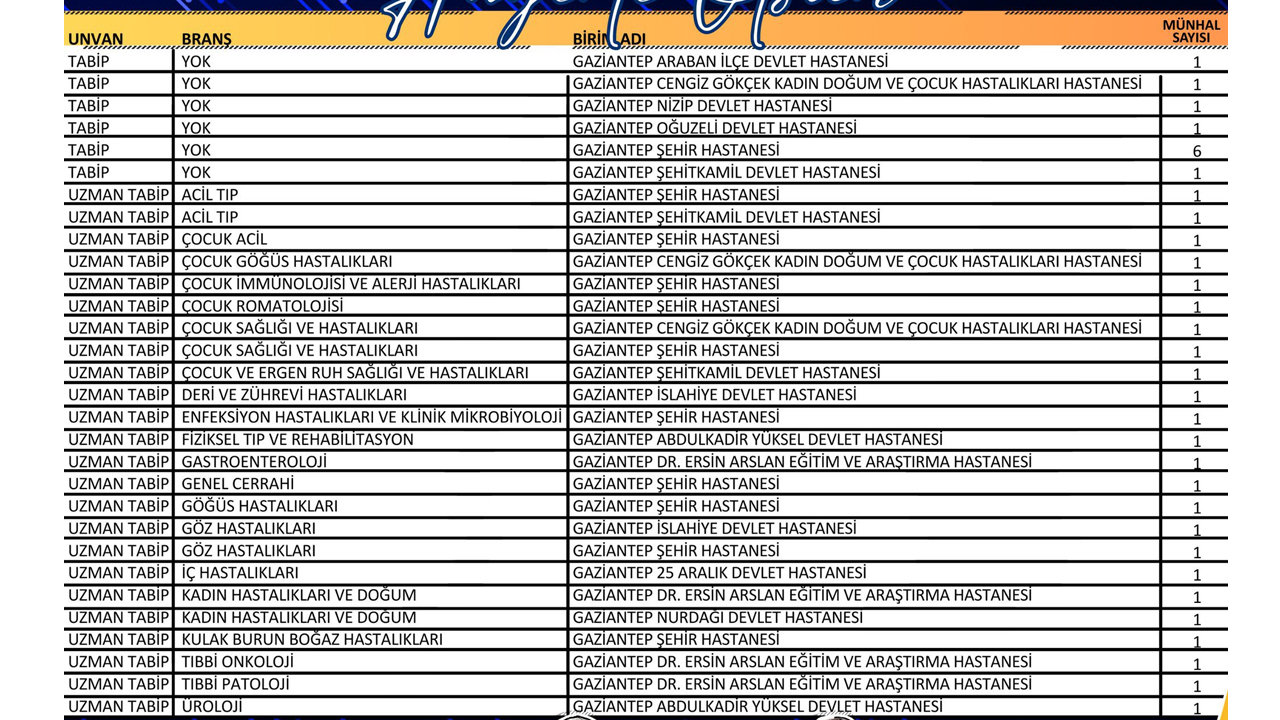 Atama yapılan branşlar arasında acil tıp, çocuk sağlığı ve hastalıkları, kadın hastalıkları ve doğum, iç hastalıkları, göz hastalıkları, genel cerrahi, enfeksiyon hastalıkları, gastroenteroloji, üroloji, kulak burun boğaz, fizik tedavi ve rehabilitasyon gibi birçok kritik alan yer aldı.